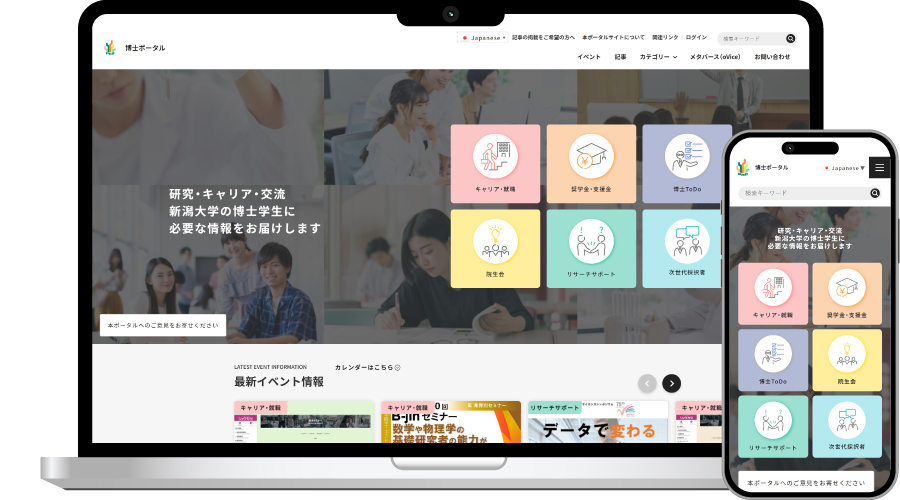 新潟大学様の博士後期課程向けに、学生が研究、キャリア形成、学生交流を効率的に行える総合ポータルサイト「博士ポータル」を開発しました。