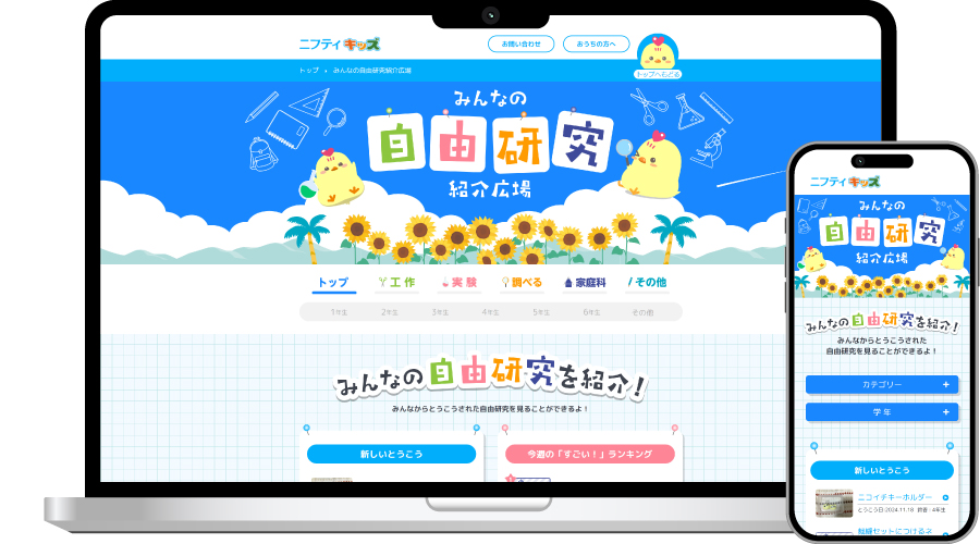 「みんなの自由研究紹介広場」はニフティ株式会社が運営する「ニフティキッズ」ポータルサイト内に位置し、小学生が自由研究の成果を発表する場を提供しています。このプロジェクトでは、既存の「みんなの自由研究紹介広場」サイトをWordPressへ移行し、サイトデザインの刷新を行いました。これにより、さまざまなデバイスでの閲覧を可能にし、データ管理の効率化を図ることを目指しました。